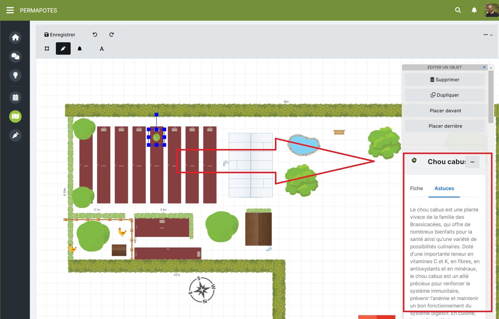 • Lorsque vous ajoutez / cliquez sur une plante dans le plan, vous découvrirez à droite sa fiche de culture, les associations et des astuces.