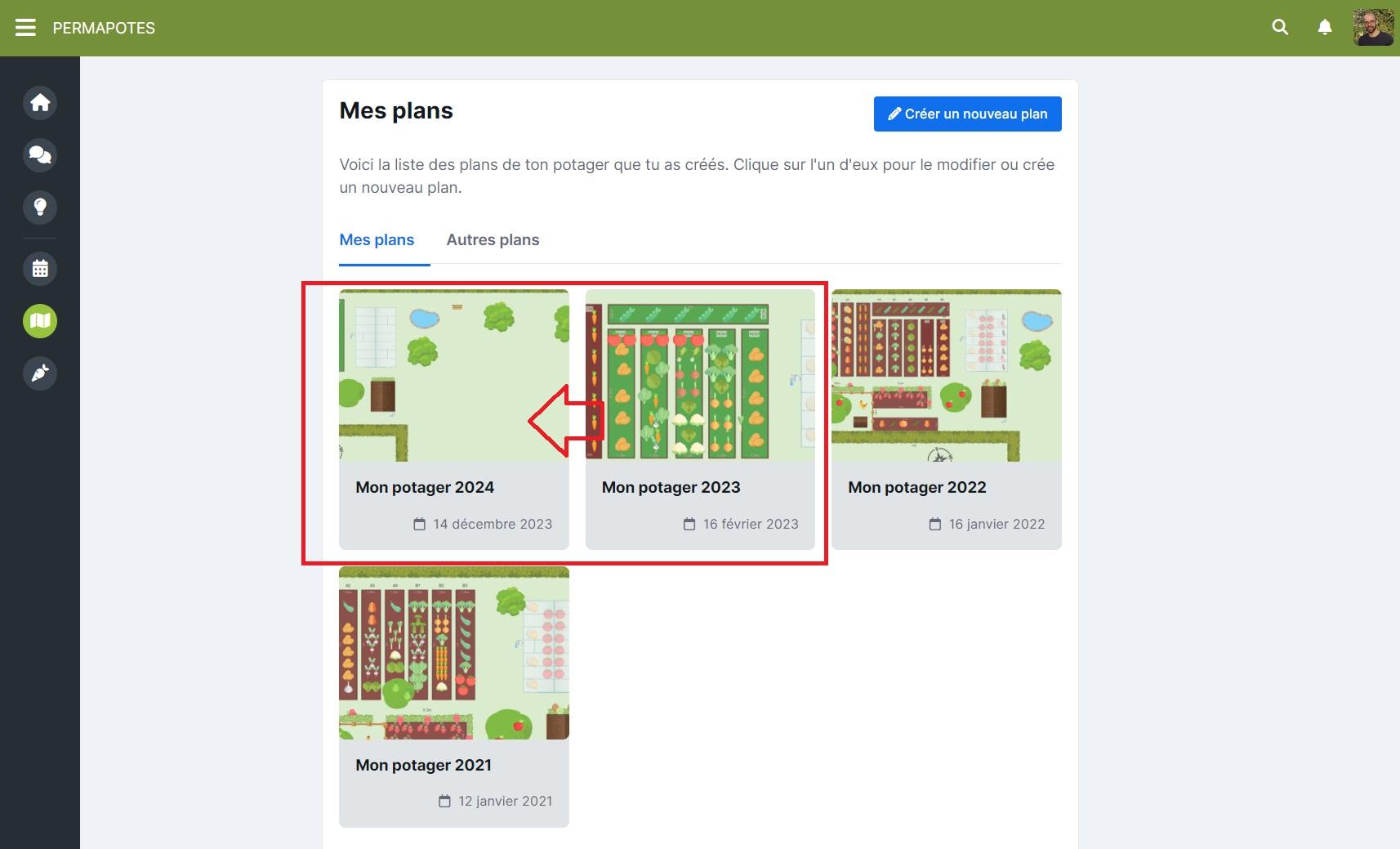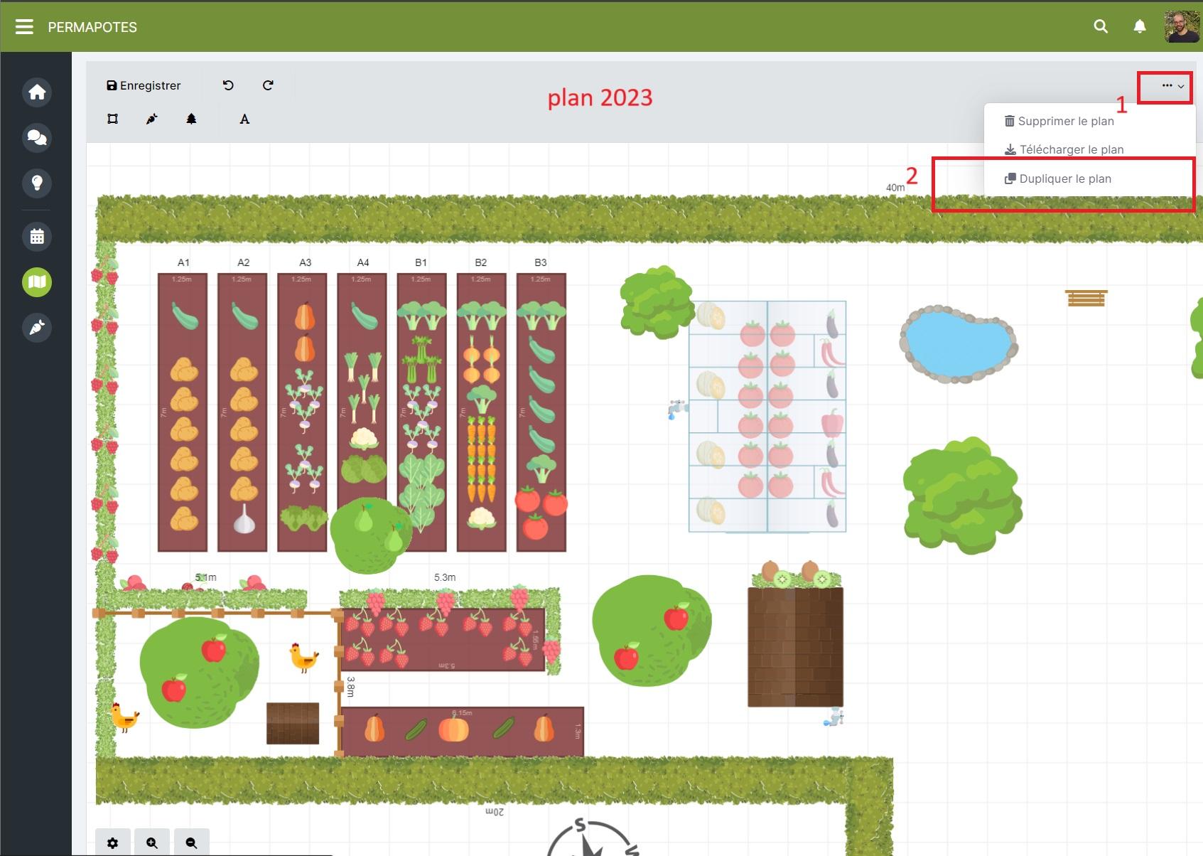 • Si vous dupliquez votre plan potager (pour en créer un nouveau pour la saison 2024 par exemple), seuls les éléments de décors et parcelles (arbres, arbustes) seront conservés.