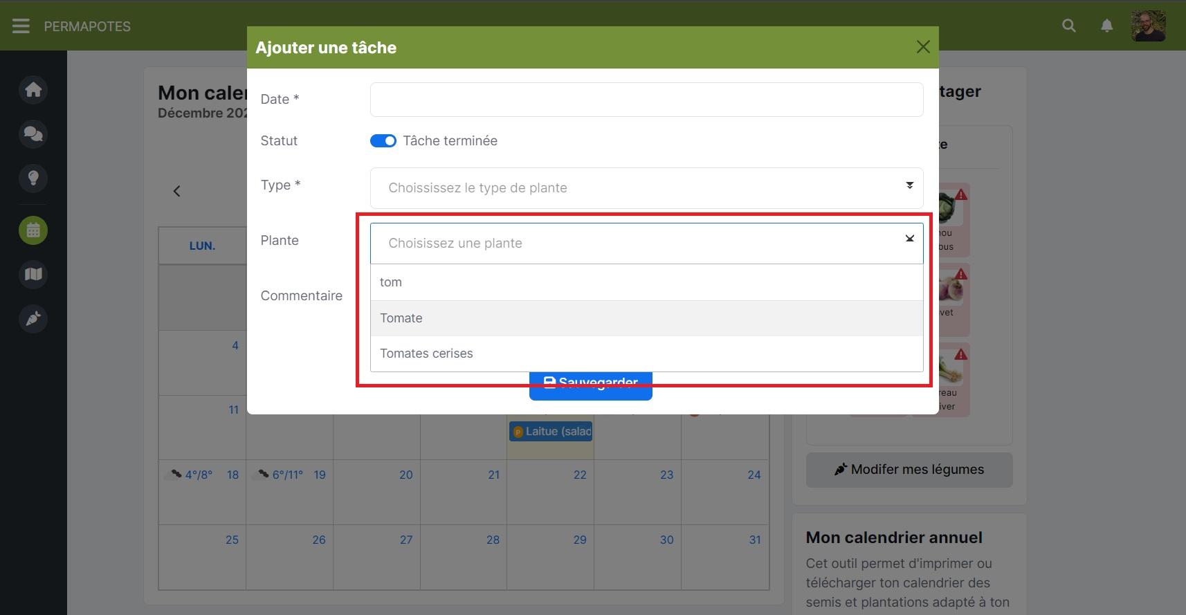 Lorsque vous ajoutez une tâche à votre calendrier, vous pouvez maintenant rechercher une plante dans la zone de sélection plutôt que de parcourir toute la liste. Le site contient désormais plus de 200 plantes donc cela devenait un peu difficile de s’y retrouver sans cette option.